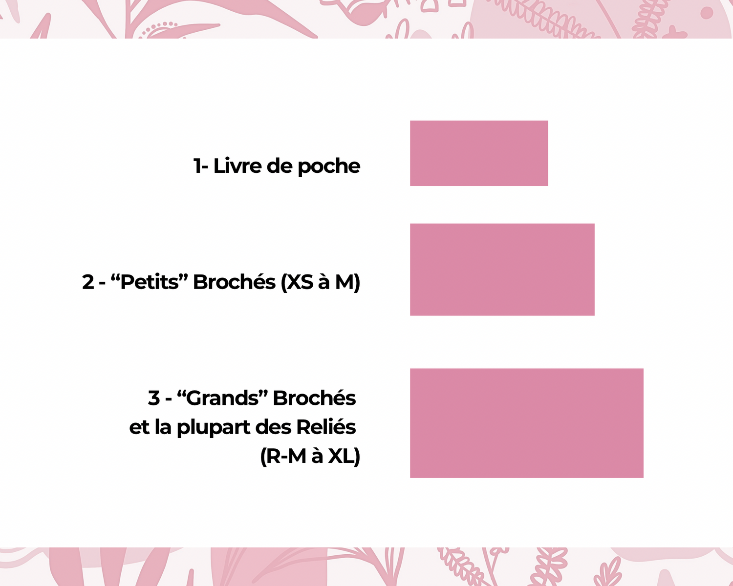 Chaque gamme sera caractérisée par la longueur du couvre-livre. Généralement, plus le livre est haut, plus il sera large. J’ai donc défini 3 gammes, pour principalement vous interpeller sur le fait qu’un couvre-livre de la taille 3 (de R-M à XL ou plus), ne pourra pas couvrir un livre de taille 2 « Petit Brochés ». Tout simplement parce que le couvre-livre sera trop long, et ne pourra pas être installé de manière optimale.