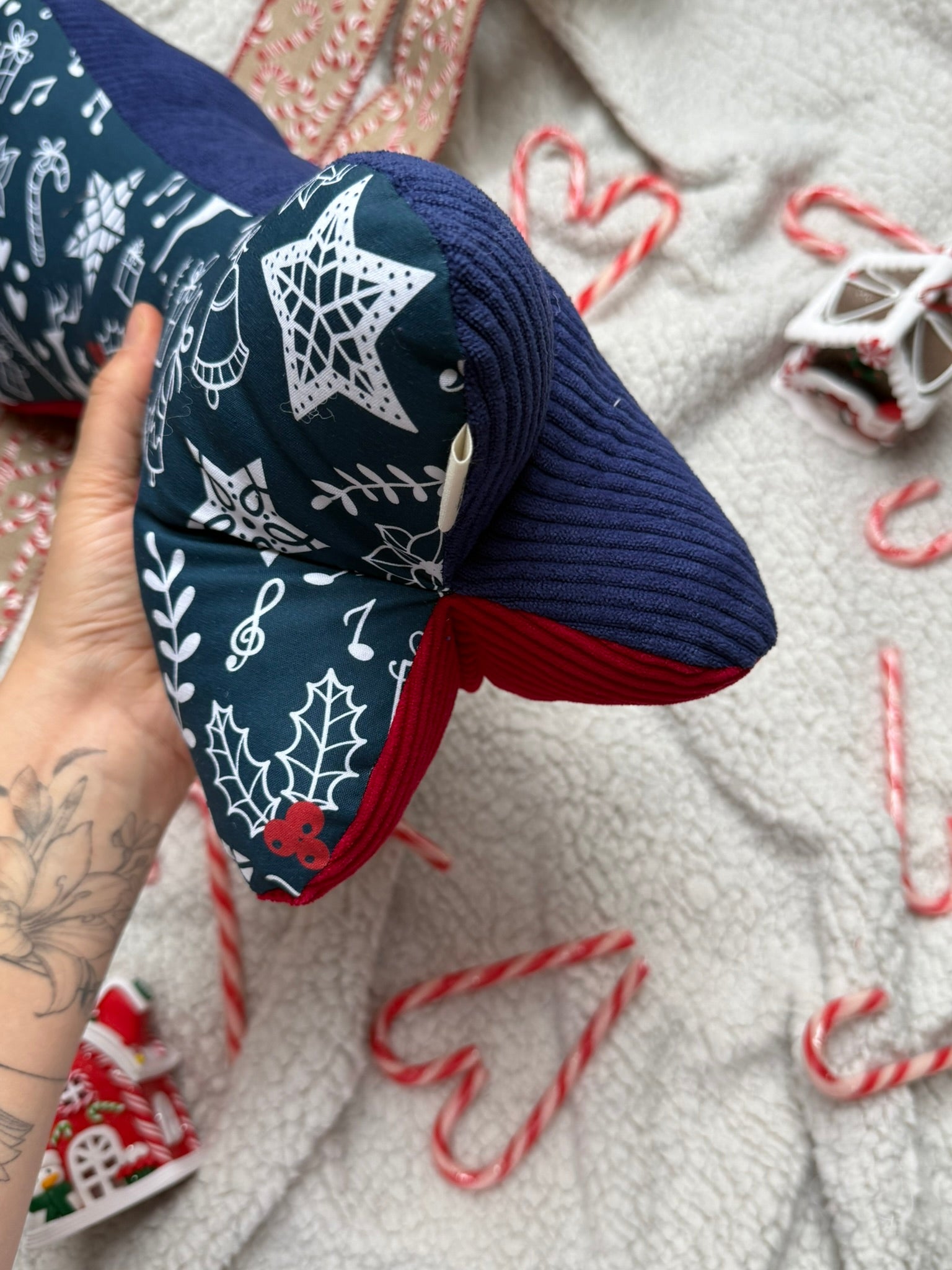 - Rembourrage : Ouate de coton et polyester (60% coton, 40% polyester), issue de chutes industrielles recyclées - environ 300g